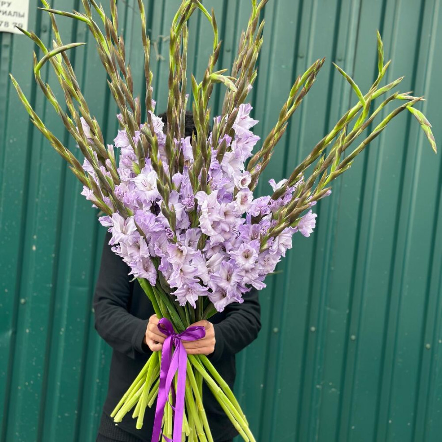 На фото букет из 25 сиреневых гладиолусов. В составе: гладиолус 25 шт, атласная лента 1 шт, . Все цветы свежие и ароматные, букет красиво оформлен и отлично подходит для подарка. Доступна доставка цветов или самовывоз.