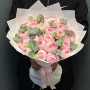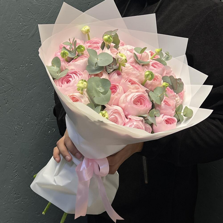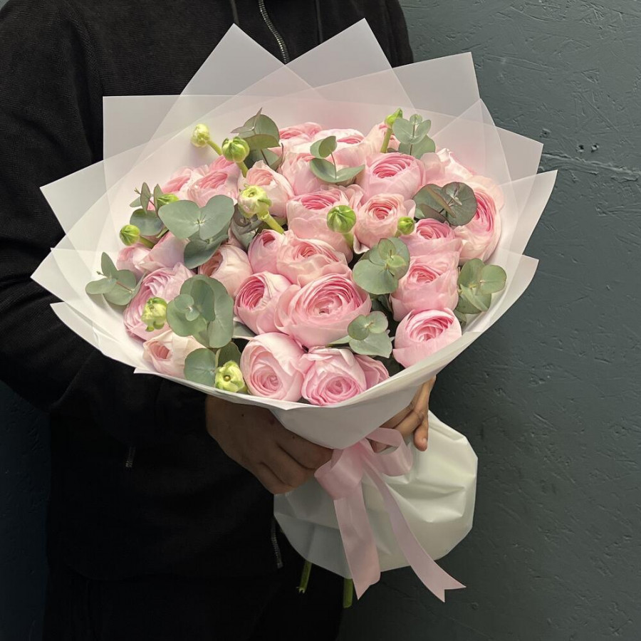 На фото букет из 29 розовых ранункулюсов с эвкалиптом. В составе: ранункулюс 29 шт, эвкалипт 10 шт, дизайнерская упаковка 2 шт, атласная лента 1 шт, . Все цветы свежие и ароматные, букет красиво оформлен и отлично подходит для подарка. Доступна доставка цветов или самовывоз.