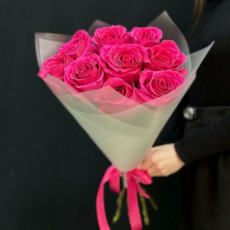 На фото букет из 9 малиновых роз. В составе: роза 9 шт, крафт-бумага 1 шт, атласная лента 1 шт, . Все цветы свежие и ароматные, букет красиво оформлен и отлично подходит для подарка. Доступна доставка цветов или самовывоз.