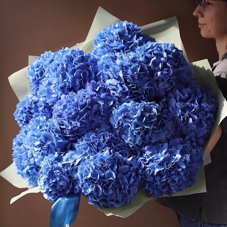 На фото букет из 15 голубых гортензий. В составе: гортензия 15 шт, крафт-бумага 1 шт, атласная лента 1 шт, . Все цветы свежие и ароматные, букет красиво оформлен и отлично подходит для подарка. Доступна доставка цветов или самовывоз.