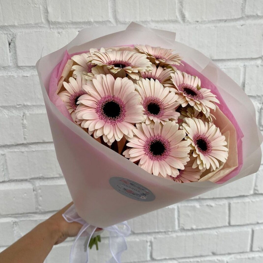 На фото букет из 15 розовых гербер. В составе: гербера 15 шт, крафт-бумага 1 шт, атласная лента 1 шт, . Все цветы свежие и ароматные, букет красиво оформлен и отлично подходит для подарка. Доступна доставка цветов или самовывоз.