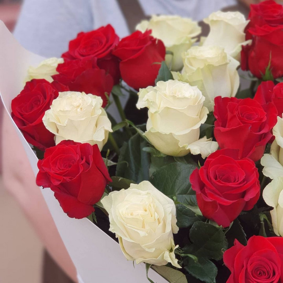 На фото букет из 27 белых и красных роз. В составе: роза 27 шт, крафт-бумага 1 шт, атласная лента 1 шт, . Все цветы свежие и ароматные, букет красиво оформлен и отлично подходит для подарка. Доступна доставка цветов или самовывоз.
