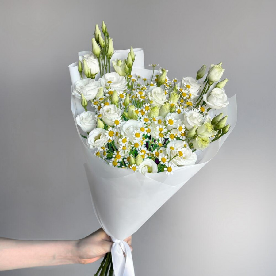 На фото букет из белых эустом и ромашки. В составе: эустома (лизиантус) 5 шт, танацетум 4 шт, дизайнерская упаковка 1 шт, атласная лента 1 шт, . Все цветы свежие и ароматные, букет красиво оформлен и отлично подходит для подарка. Доступна доставка цветов или самовывоз.