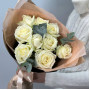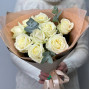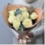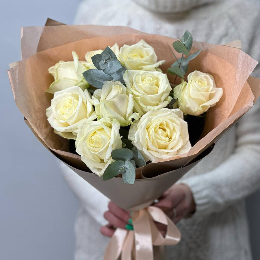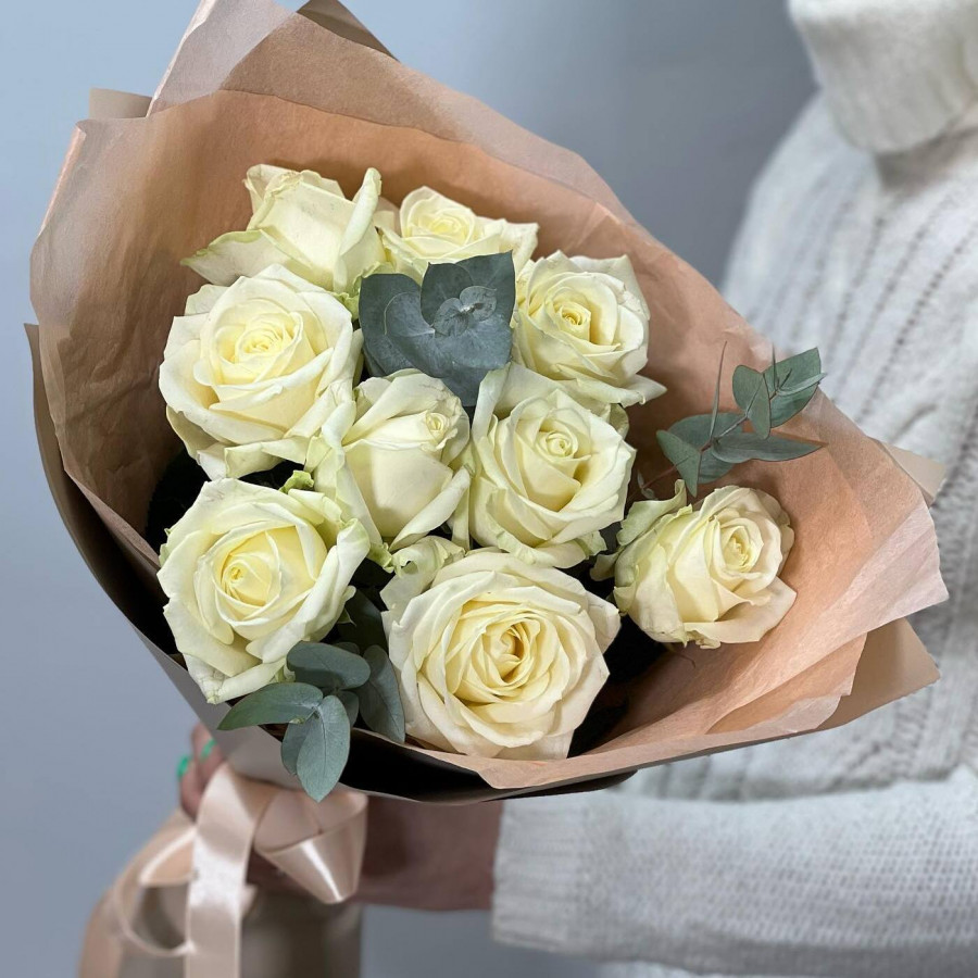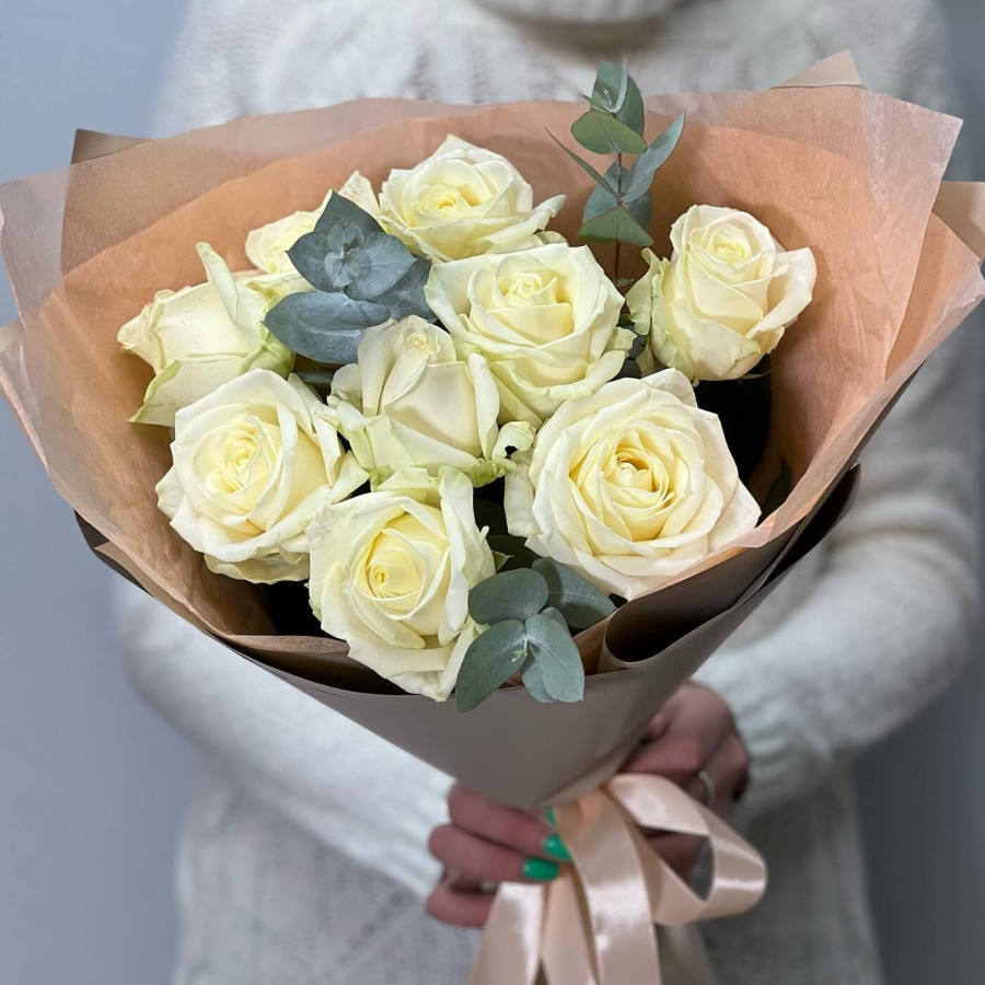 На фото букет из белых роз с эвкалиптом. В составе: роза 9 шт, эвкалипт 2 шт, крафт-бумага 1 шт, . Все цветы свежие и ароматные, букет красиво оформлен и отлично подходит для подарка. Доступна доставка цветов или самовывоз.
