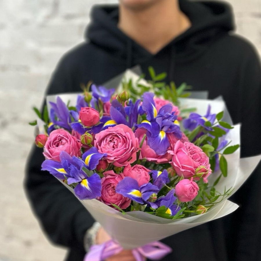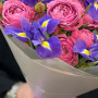 Букет из розовых пионовидных роз и синих ирисов в Новоалтайске