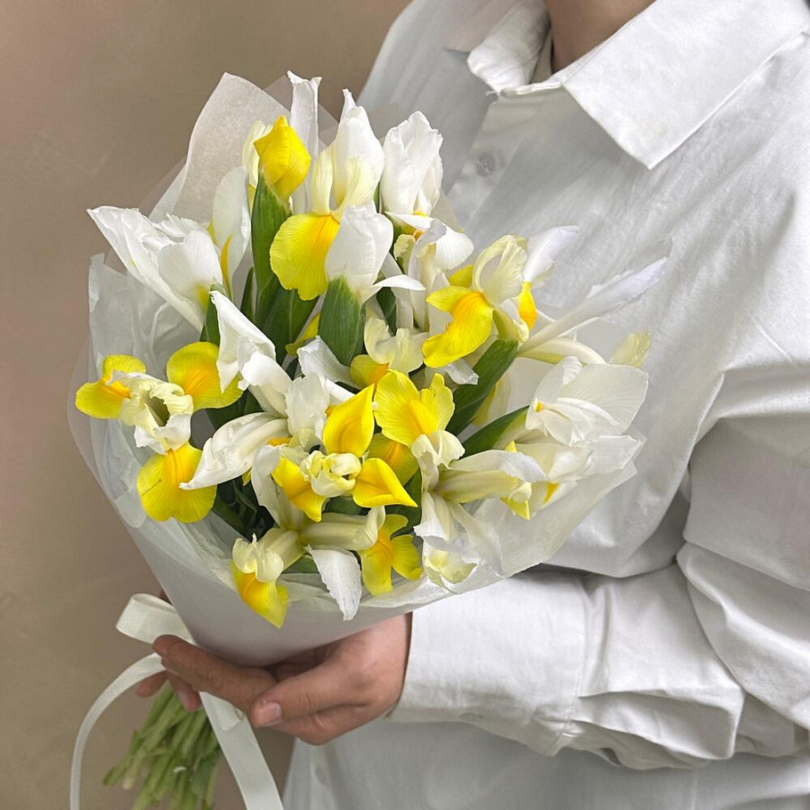 На фото букет из желтых и белых ирисов. В составе: ирис 15 шт, атласная лента 2 шт, дизайнерская упаковка 2 шт, . Все цветы свежие и ароматные, букет красиво оформлен и отлично подходит для подарка. Доступна доставка цветов или самовывоз.