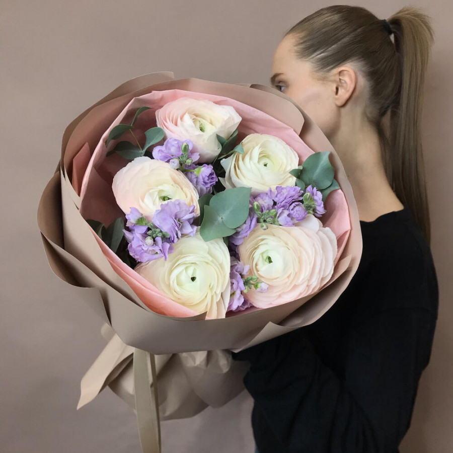 Букет из розовых ранункулюсов и сиреневой матиолы в Новоалтайске
