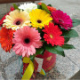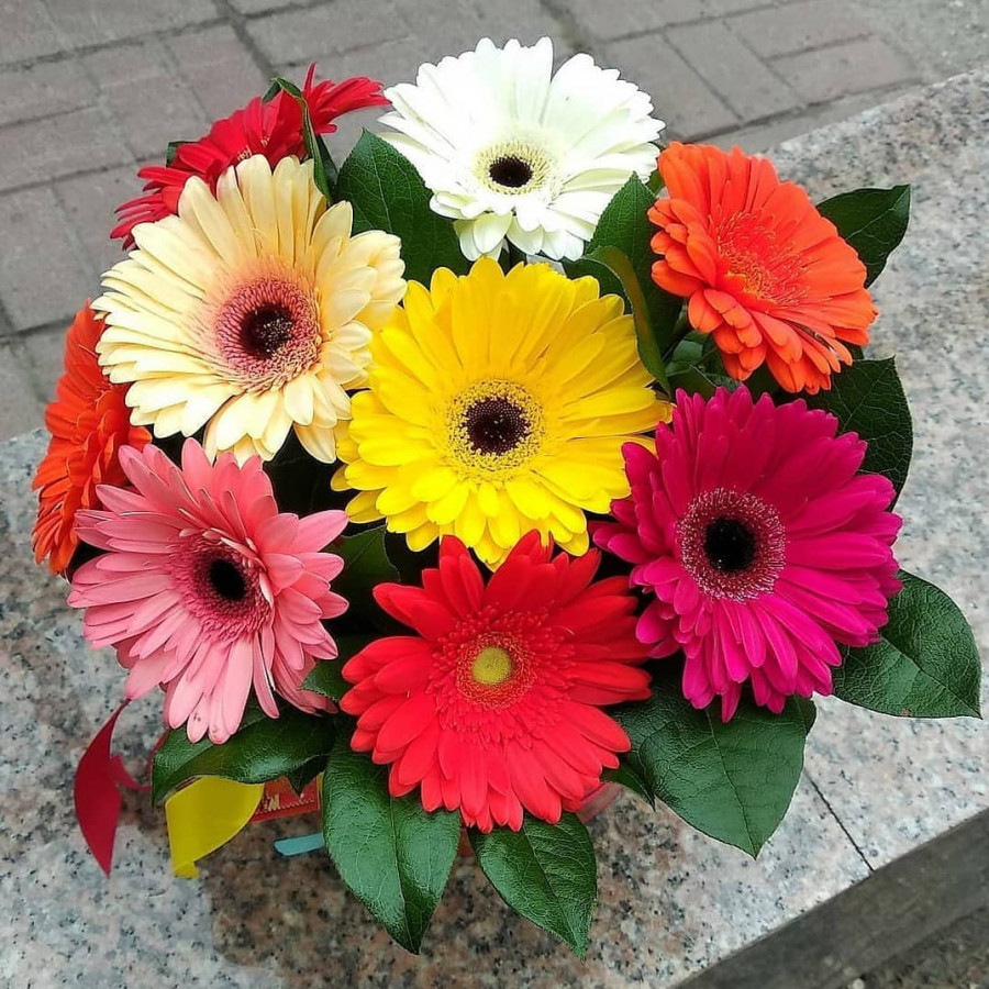 На фото композиция из 9 разноцветных гербер в шляпной коробке. В составе: гербера 9 шт, коробка (s) 1 шт, . Все цветы свежие и ароматные, букет красиво оформлен и отлично подходит для подарка. Доступна доставка цветов или самовывоз.
