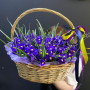Лента атласная - 2 шт. Корзина плетеная - 1 шт. Открыточка с вашими пожеланиями - 1 шт. Оазис флористический - 1 шт. Ирис фиолетовый - 101 шт. инструкция по уходу за цветами - 1 шт. хорошее настроение - 100 шт.