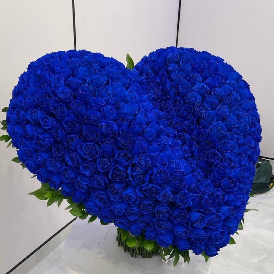 Эффектная композиция в форме сердца из 351 насыщенно-синей розы. Размер ~70×70 см. Сильный вау-эффект для признаний и особых дат.